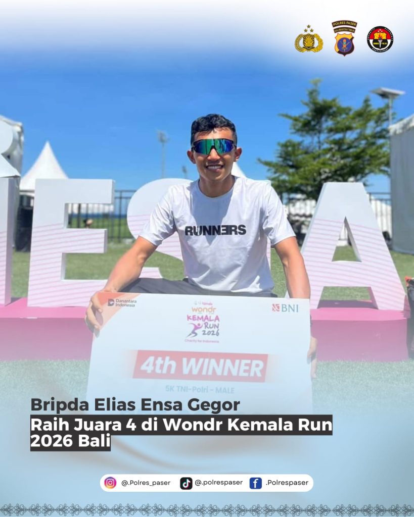 Polres Paser – Personel Polres Paser kembali menorehkan prestasi membanggakan di tingkat nasional. Bripda Elias Ensa Gegor berhasil meraih juara 4 pada ajang lari 5K dalam event Wondr Kemala Run 2026 yang digelar di Kabupaten Gianyar, Minggu (19/04).